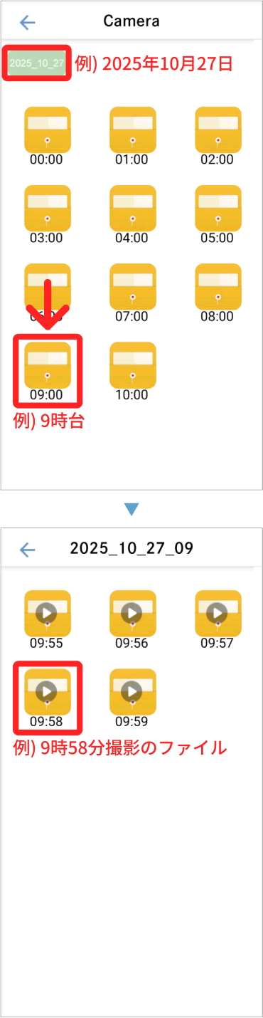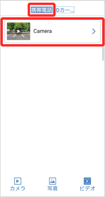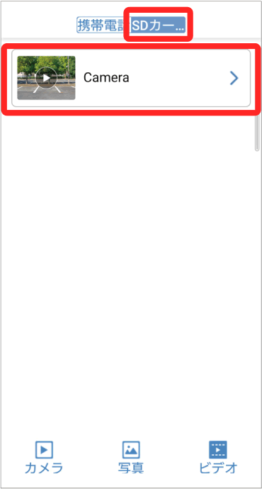 microSD カードに記録された動画とアプリ内に記録された動画がそれぞれ保存されています。