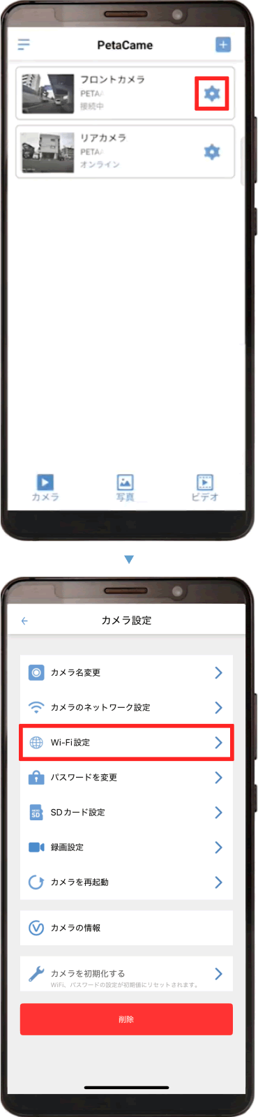 ※カメラがオフラインの時は、アプリから初期化はできません。カメラ本体のリセットホタンを押してください。