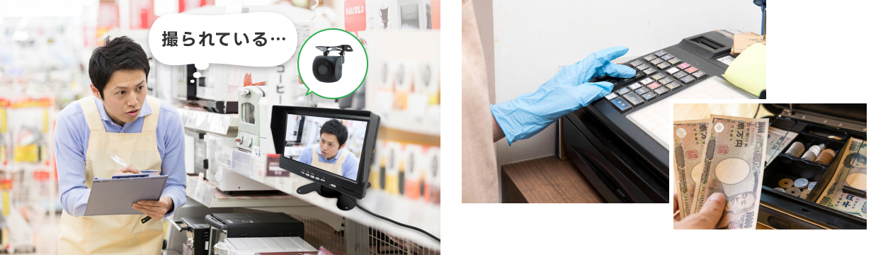 商品を手に取るところが目の前で映し出されることで、犯行を効果的に抑制します。