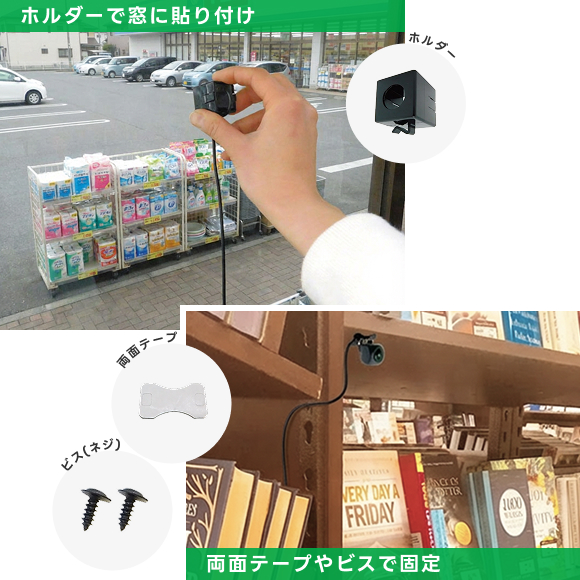 カメラホルダーを使用してガラスに貼り付けることもできます。ガラス越しに中から外の監視・撮影が可能です。